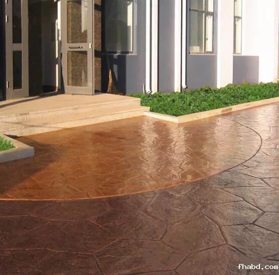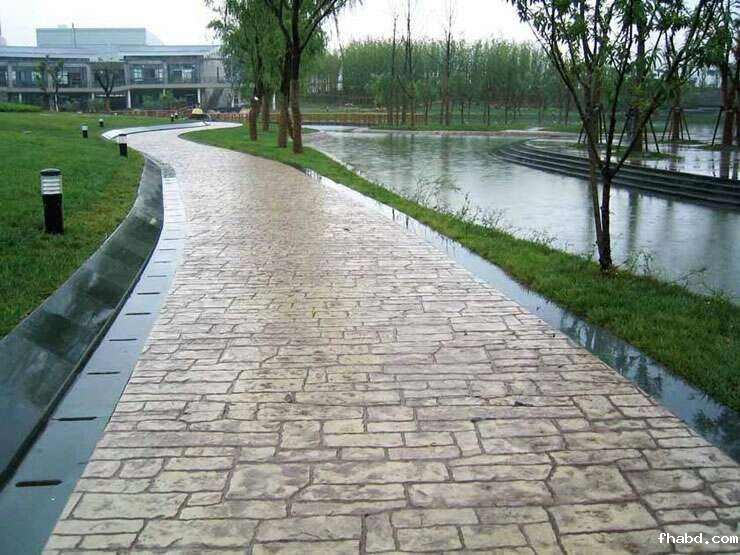压模地坪的色彩与纹理搭配的灵活性,以及成本比花岗岩、大理石等地材更低廉、更耐用的优越特性也被越来越多的建筑师认可和应用。 彩色强化料是一种彩色粉末状化学建材,该产品应用于初凝阶段的混凝土表面,与混凝土发生化学反应,对混凝土表面进行强化和渗透,使混凝土表面具有超强的耐磨和抗压抗折性能,同时赋予普通混凝土以丰富的色彩,由于它超强的渗透性和耐磨性以及抗紫外线的优异性能,使其不同于涂料或地坪漆的简单附着于混凝土表面,从而有效地避免了脱落和磨损,从而大大地提高了它的装饰性和耐用性。它主要起到美观、多样性,颜色也是丰富多彩的,这比传统的石材,道边砖占有优势,它的颜色可以任意搭配,另外它的图案可以仿造各种建材,如:鹅卵石、木材、道边砖等。压模地坪具有较强的艺术性和特殊装饰要求的地面材料。同时还具有耐磨、防滑、抗冻、不易起尘、易清洁、高强度、耐冲击、且色彩和款式方面有广泛的选择性、成本低和绿色环保等特点,是目前园林、市政、停车场、公园小道、商业和文化设施领域的理想选择。