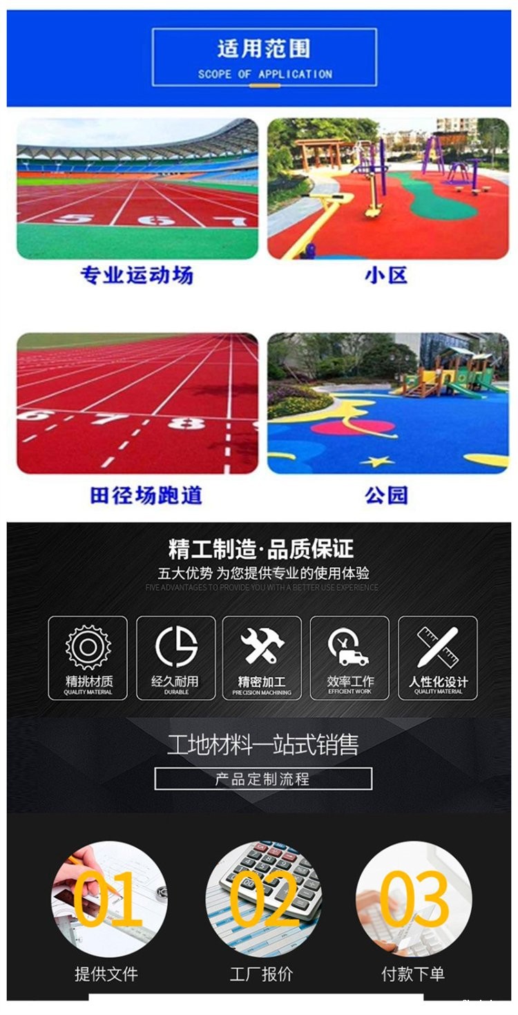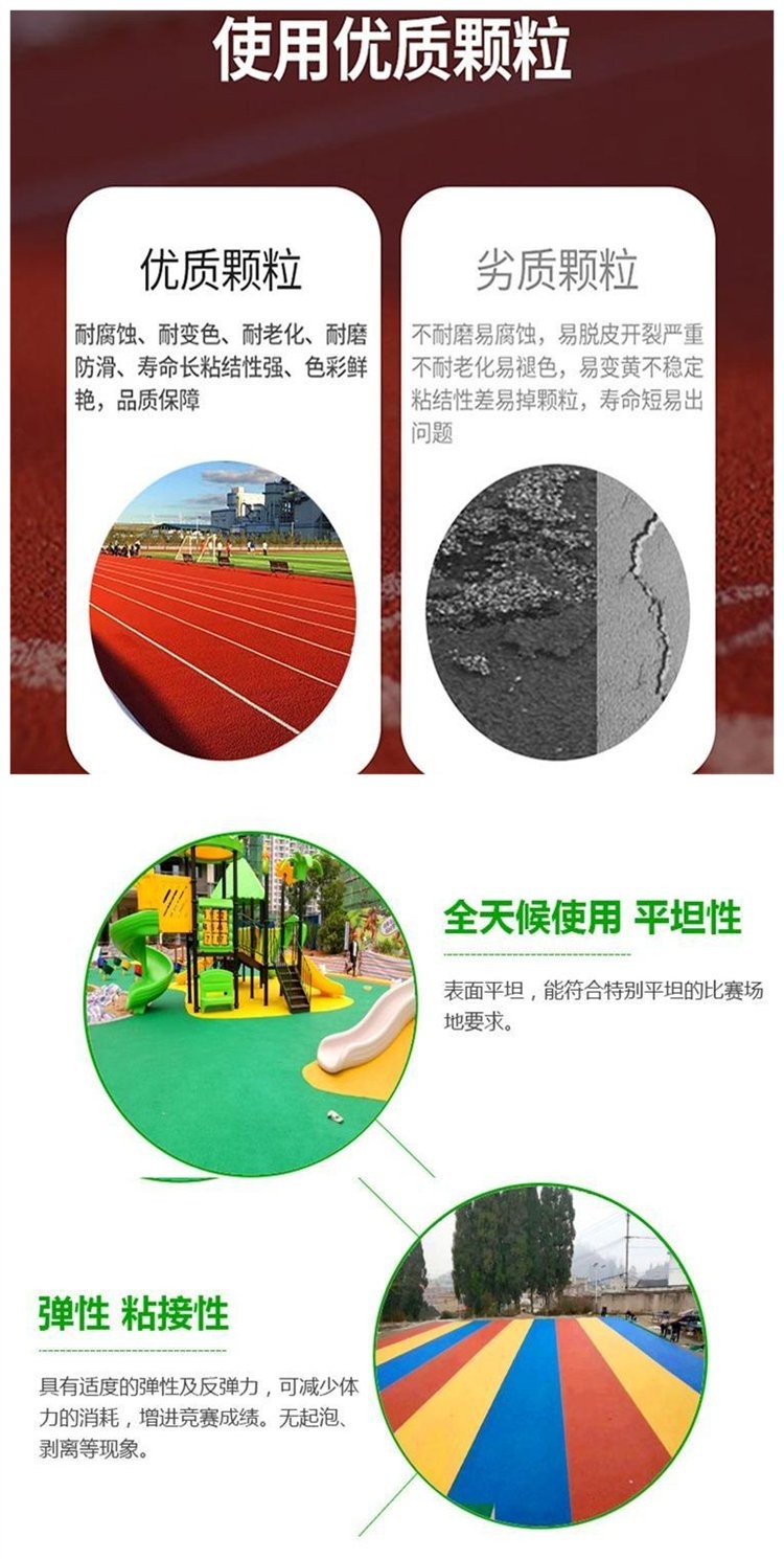 在施工中选材是非常重要的:优质颗粒具有耐腐蚀、耐变色、耐老化、耐磨防滑、寿命长粘结性强、色彩鲜艳、品质保障。